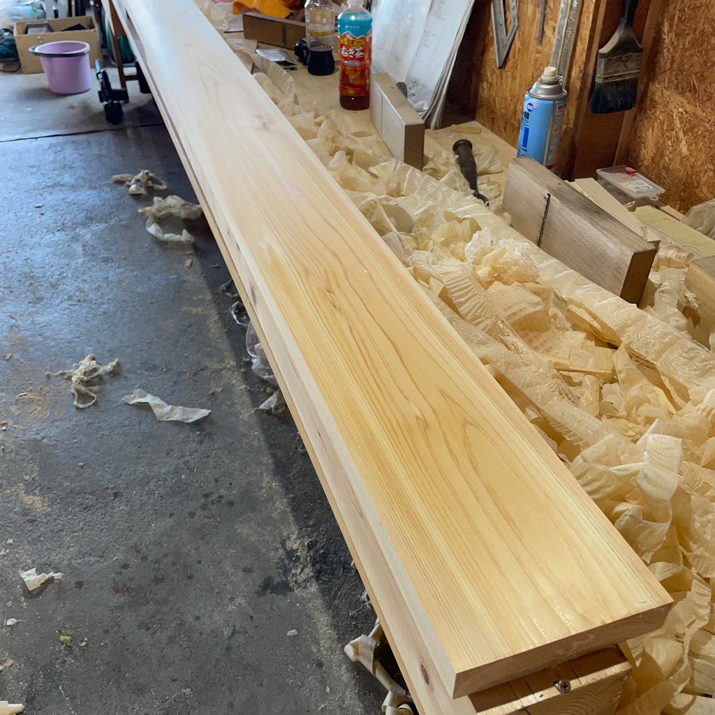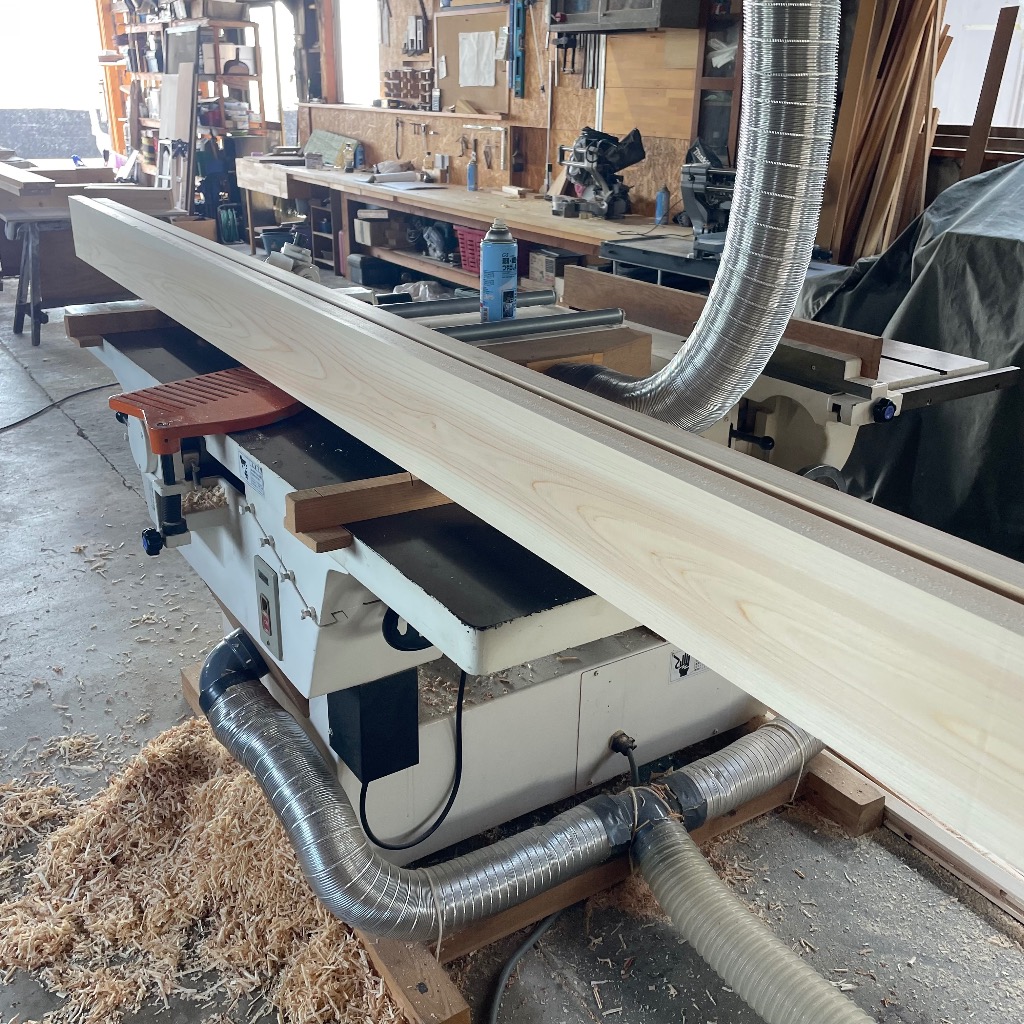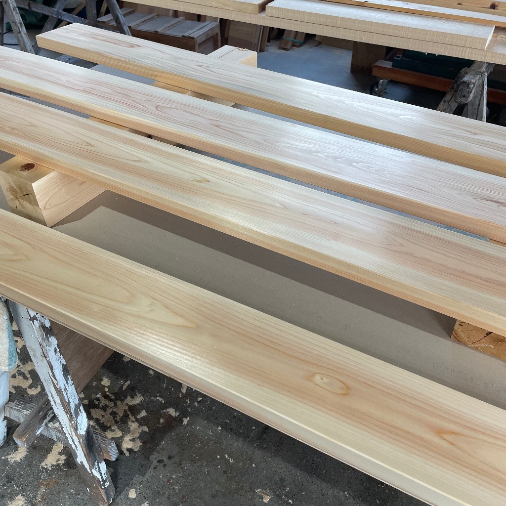 本日は、進行中の店舗内装工事で取り付ける、木製建具枠の加工の様子を紹介します。枠材には桧が指定されています。仕上げは無塗装という仕様なので、待ってましたの手鉋仕上げとさせて頂きました。工場には動力の超仕上げ鉋盤という優秀な機械があるのですが、余裕のあるときはなるべく手で鉋をかけたいというのが私のスタンスです。鉋の調子がでるまで少し時間がかかりましたが、汗だくになりながらも、なんとか合格ラインにのせることができました。仕上がった枠材は、薄いピンク色にさらりとした手触りで、静かに光を放っています。